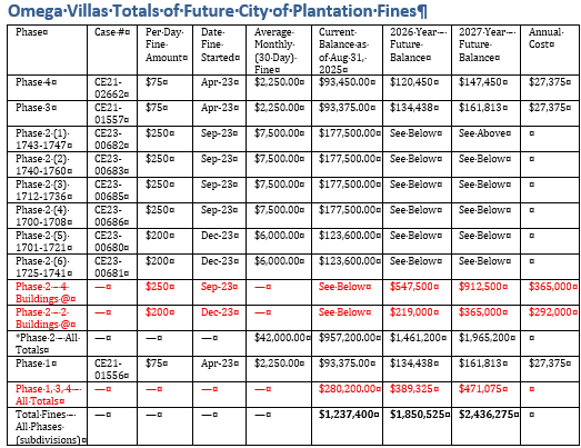📊 Last Updated: September 25, 2025 – Totals reflect City of Plantation fines through August 31, 2025, including projected annual costs for 2026–2027. Current cumulative exposure: $1,237,400 (rising to $2,436,275 by 2027 if unaddressed).