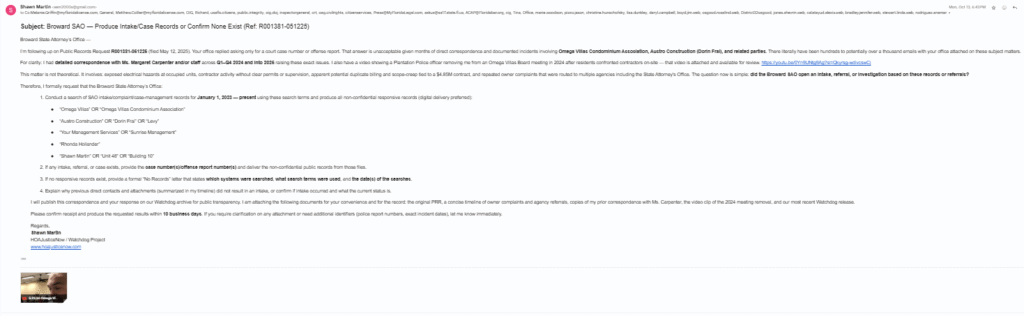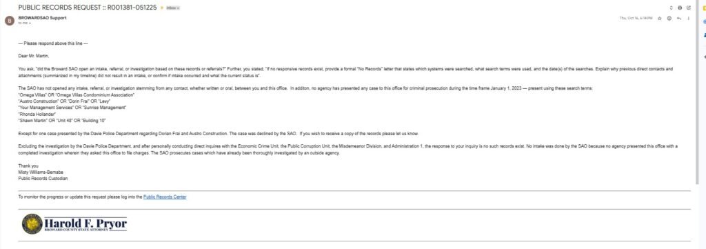 In parallel with the SAO’s October 2025 response, Assistant State Attorney Margaret Carpenter had previously confirmed by email that no case or investigation had ever been opened by the Broward SAO regarding Omega Villas.