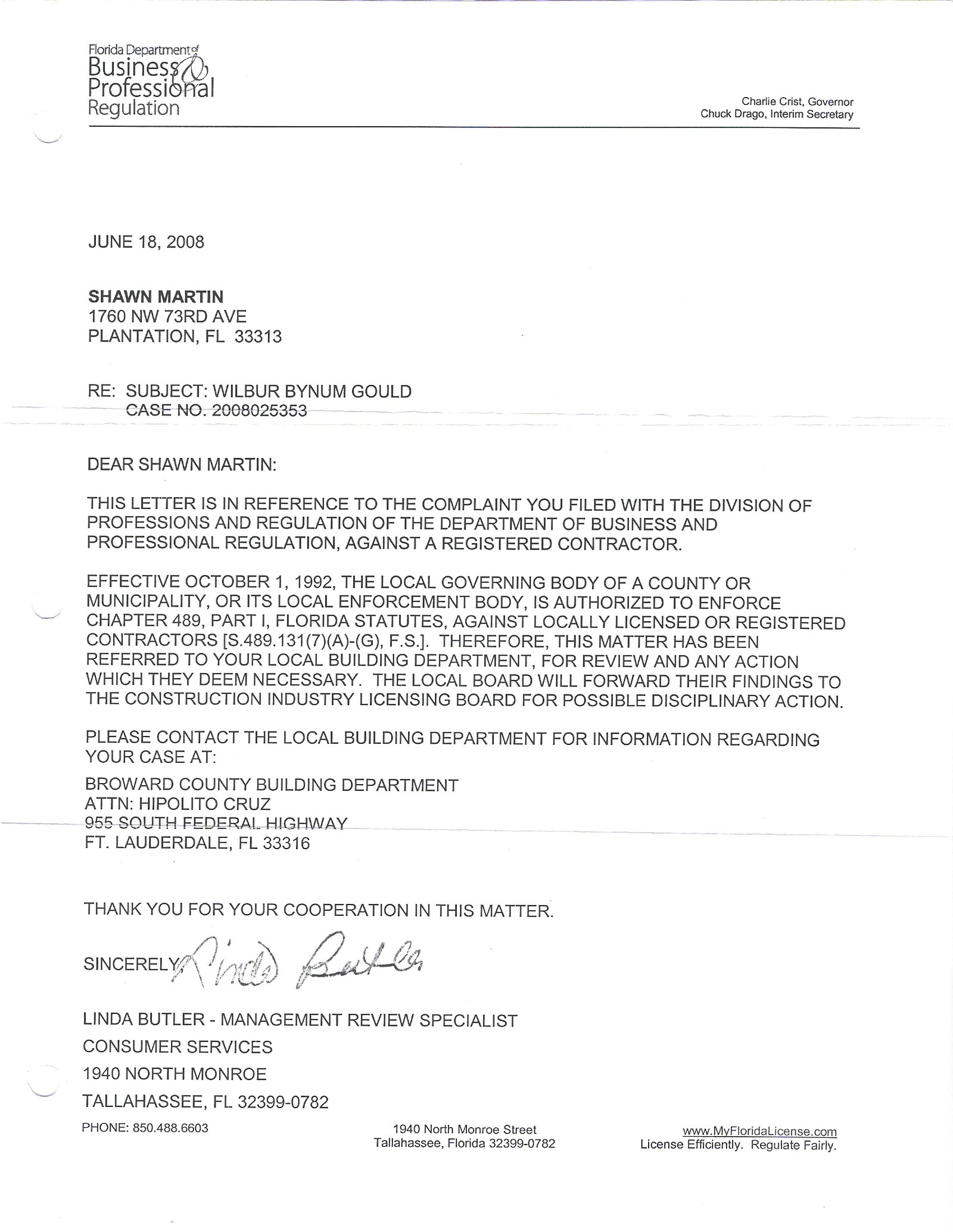 - 🚨🚨2008 DBPR email stating they were deferring this complaint to City of Plantation Building Department: 2008 Gould Roofing DBPR Complaint
