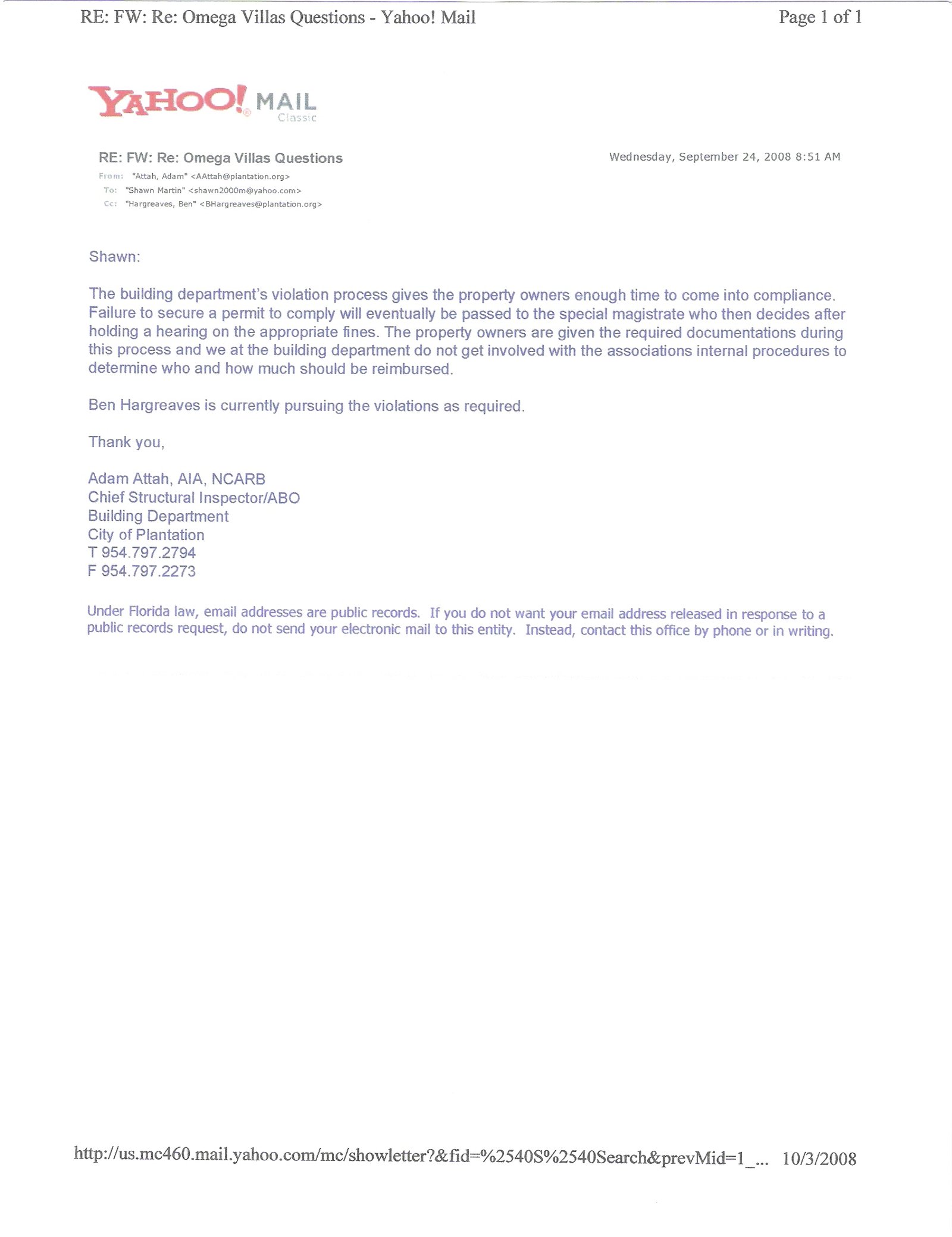 - 🚨🚨Both Gould Roofing & Pagan Work Involved: City of Plantation Chief Building Inspector Emails on Citations: Adam Attah email 8.5.08 & 2008 City Chief Building Inspector Adam Attah email on upcoming Citations/Fines