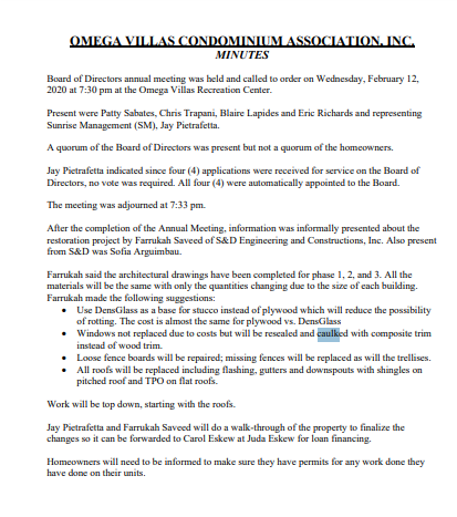 - January 20, 2023 BOD (Present were Board Members Patty Sabates, Eric Richards, Blaire Lapides, and Renata Bukharayeva. Representing Sunrise Management (SM) was Jay Pietrafetta. Also present was Hector Medina from The Loomis Company who is the insurance underwriter. None were absent.): “Update on Electrical Work: Jay Pietrafetta met with Chris Cavaliere and Joe Borrelli, Cavaliere Electric & Sons, on the previous Thursday. He reported that Phase 1, Phase 2 and Phase 3 have been completed and Phase 4 is about half completed. Patty Sabates asked for copies of the closed permits for the files and indicated that payment would be held until the closed permits were received. Roof/Structural Work Repairs: Patty Sabates asked for a contract that included more detail for the scope of work for the roof repairs and approval from the Association attorney prior to signing it. Jay Pietrafetta said Carol Eskew of Juda Eskew asked for a breakdown of roofing costs by phase. Farrukh Sayeed, S&D Engineering and Construction, and Levy Horvath, Austro Construction, prepared the scope of work and forwarded it to Juda Eskew.”